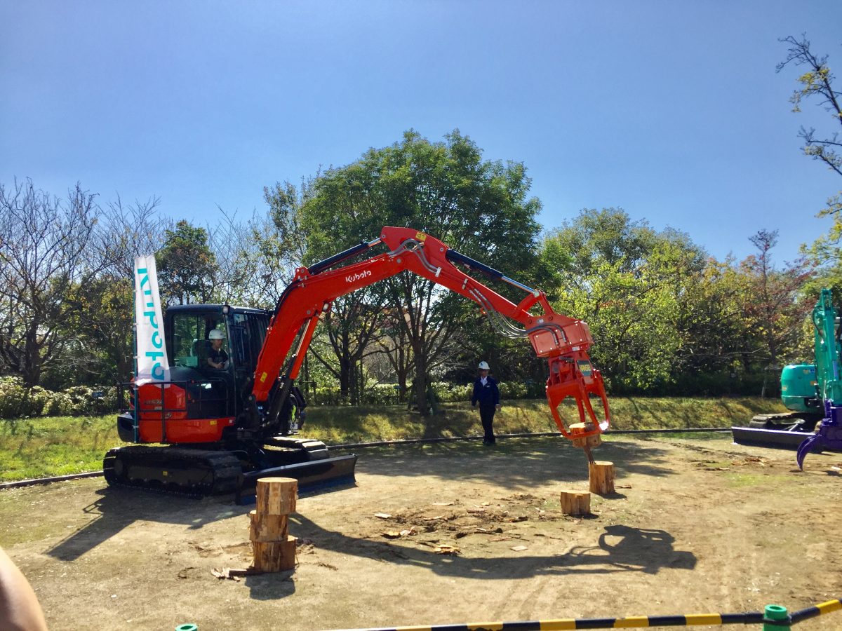 そんな中、KITAKIKAIは林業用ショベルで“丸太の積み木”が体験できる