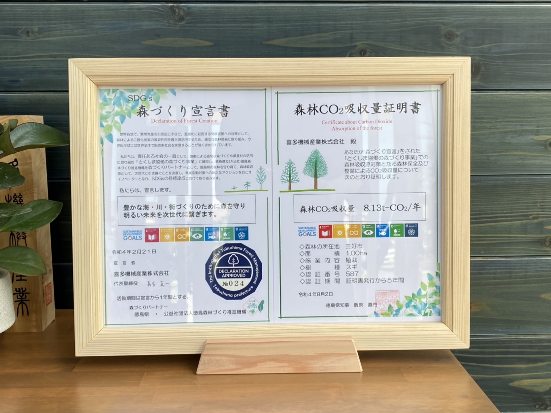 令和4年度とくしま森林づくり交流の集いに参加しました♪ とくしま森林づくり交流の集いに参加し、森林CO2吸収量証明書をいただきました! 喜多機械はこれからも自然と共存できる持続可能な街づくりに貢献していきます🌱