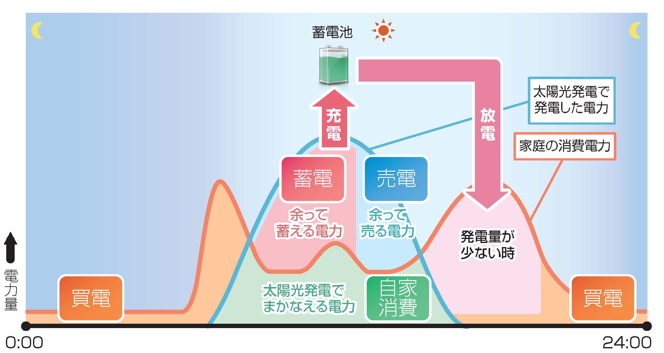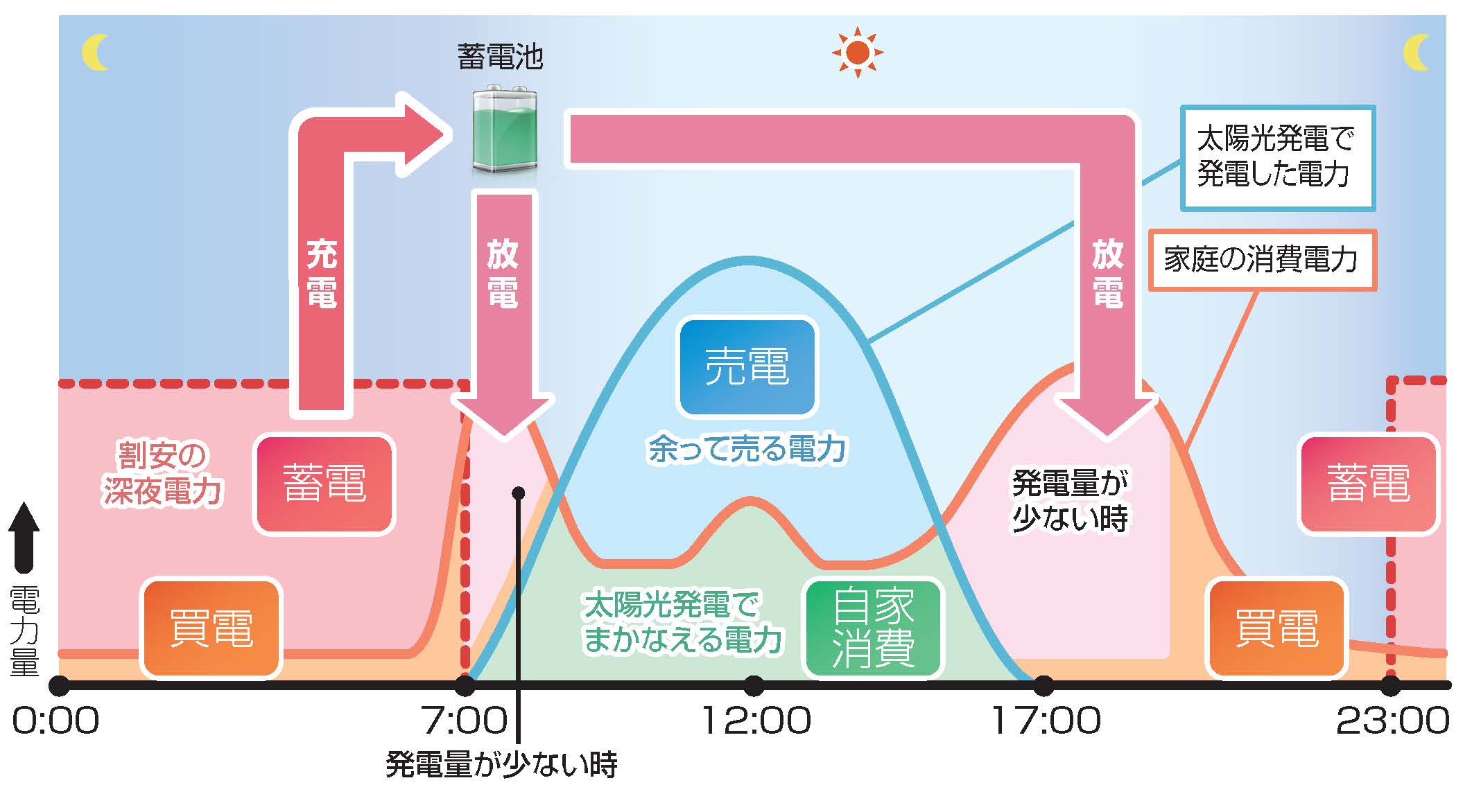 太陽光発電で余った電力は売電し、夜間の割安な電力を蓄電。