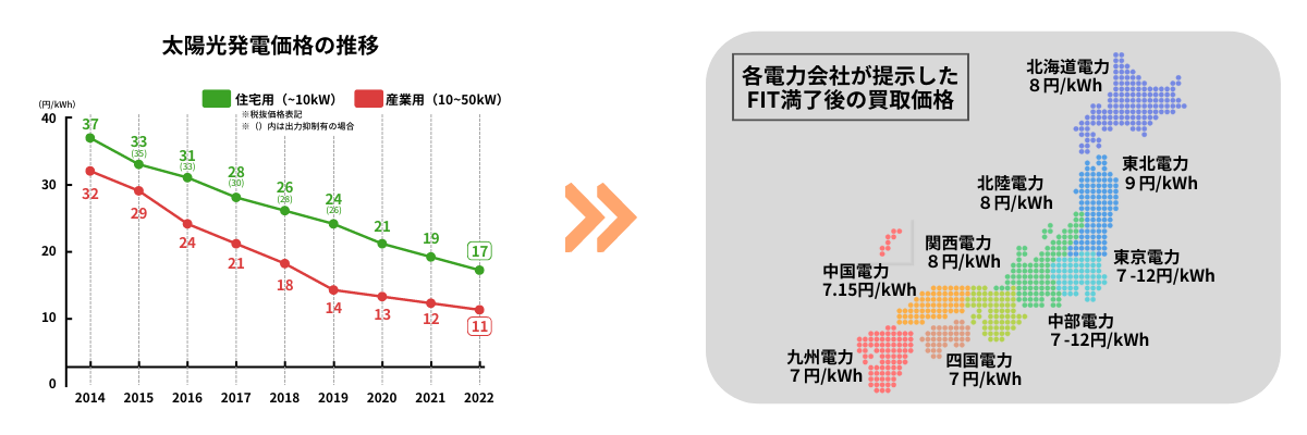 太陽光発電システムを設置して10年が経つと固定価格買取期間が終わり、高かった売電価格が市場価格に委ねられます。これまで一番高い方で42円で売電できていたものが急に6分の1の8円などに下がってしまいます。