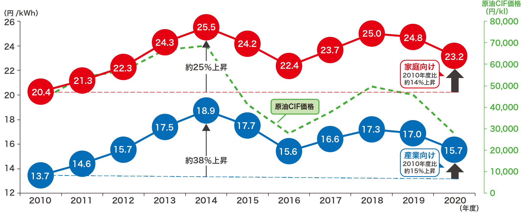 東日本大地震以降、電気料金の値上げが相次ぎ、電気料金は大幅に上昇するも、2014年度以降は原油価値の下落などにより料金水準は一旦は低下。しかし、その後、石炭や液化天然ガス(LNG)などの輸入価格高騰の影響や、再生可能エネルギー発電促進賦課金(再エネ賦課金※)も毎年値上がり傾向にあり、電気料金が願利する要因が揃っているため、今後も電気料金の値上がり傾向が続いていくと言われています。